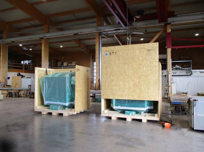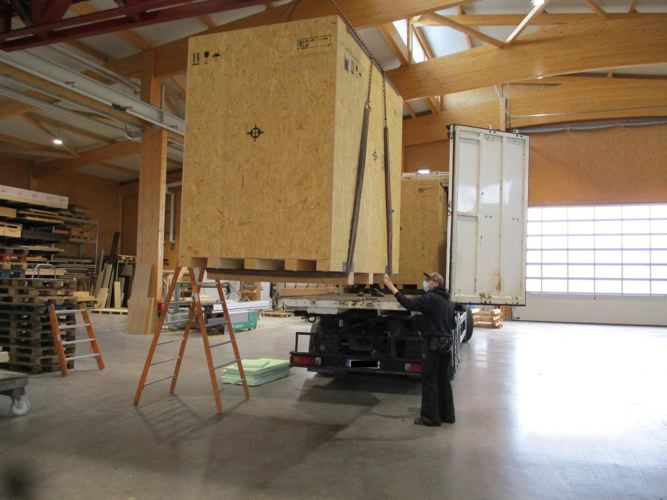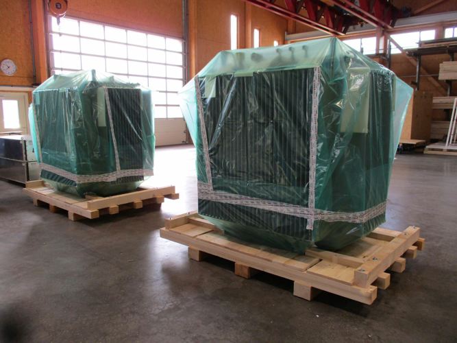 : Transportkiste aus OSB laut IPPC-Standard. Stauen und Verpacken der Teile. Konservierung mit VCI-Schaum und Folie und LKW-Verladung.