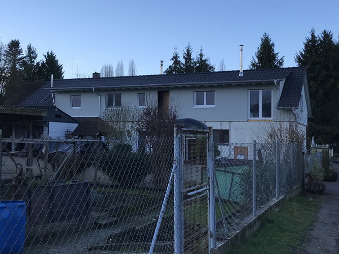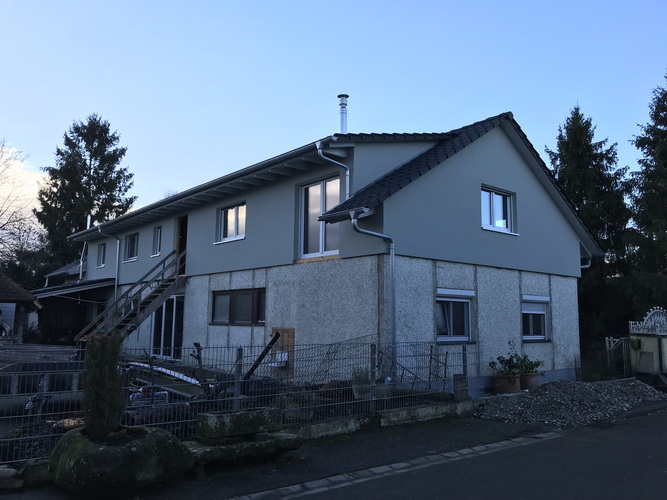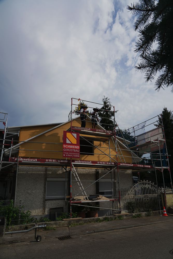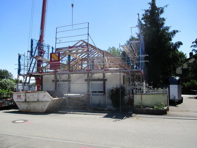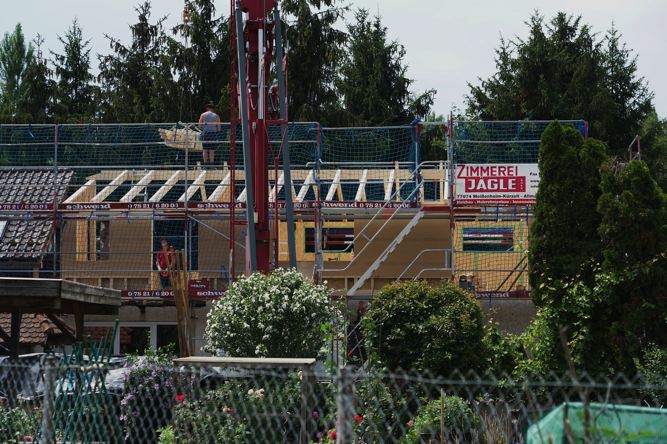 Fassade: Abbrucharbeiten des alten Dachstuhls // Erneuerung der Dachsparren und des Steildach // Einbau der Firstpfette und Zwischenbünde // Neue Schleppgauben // Dachausbau und -eindeckung