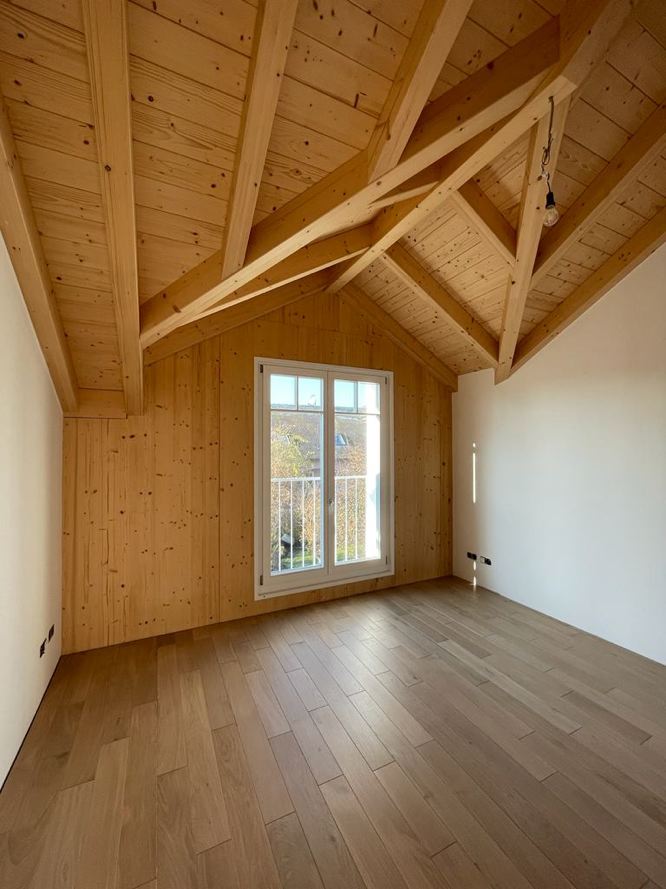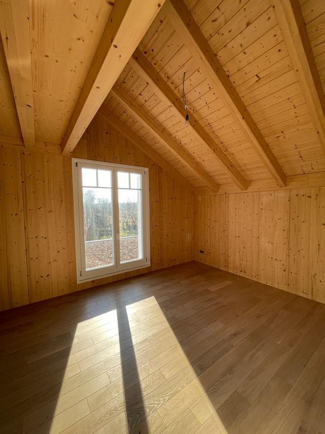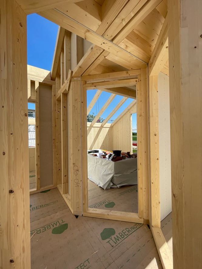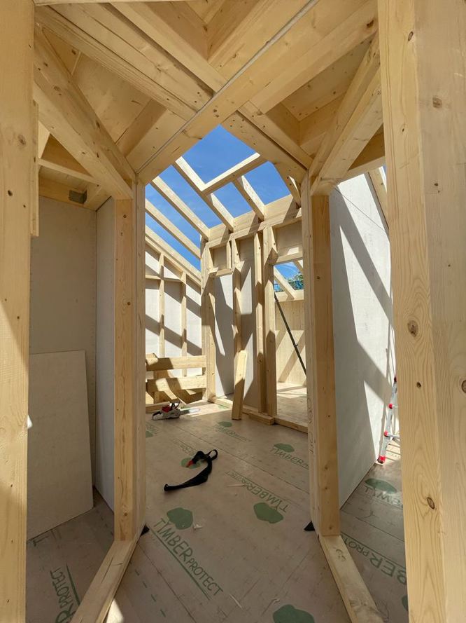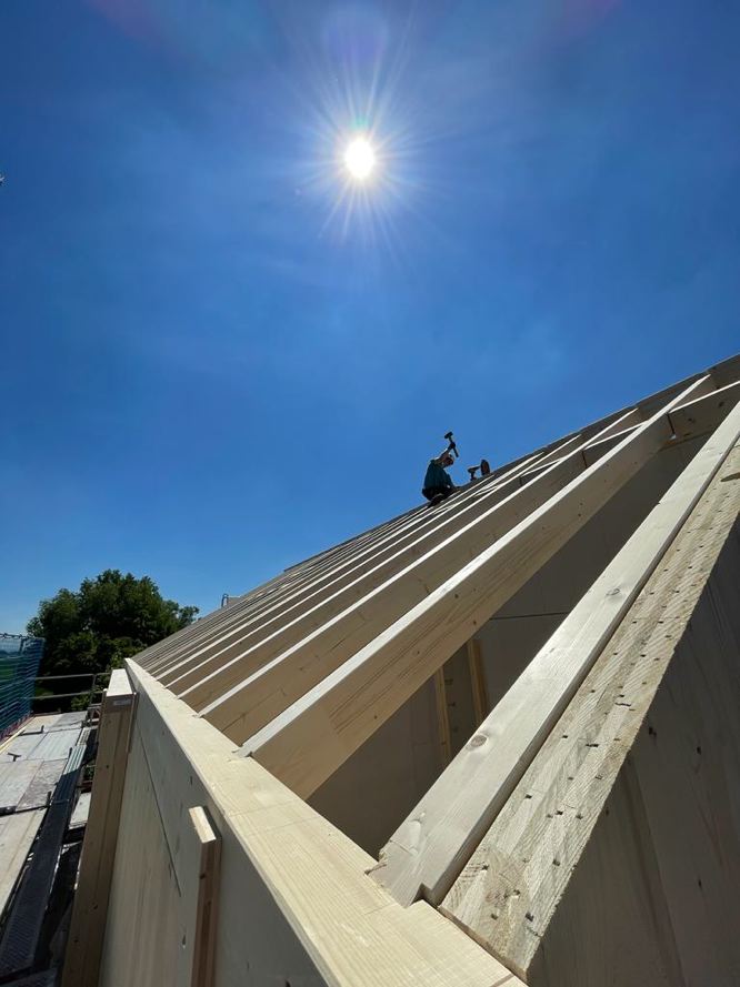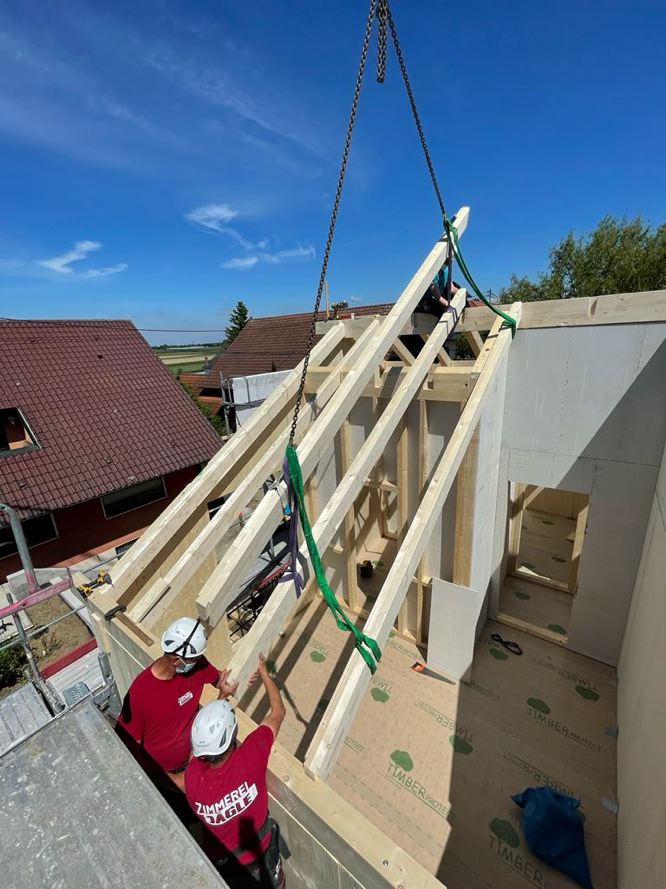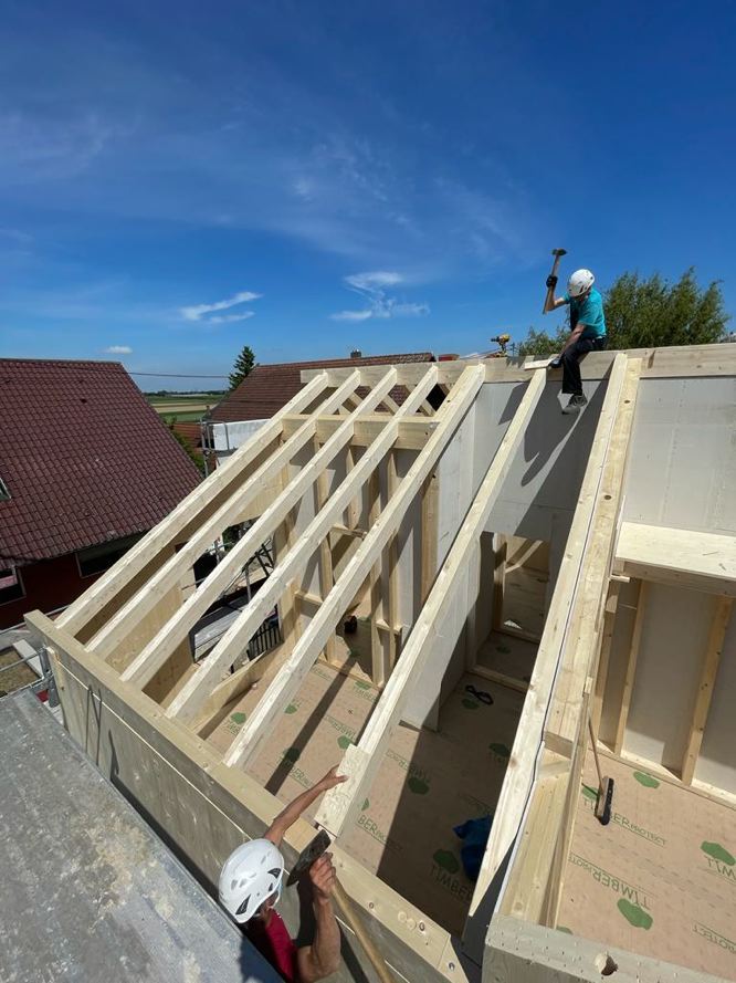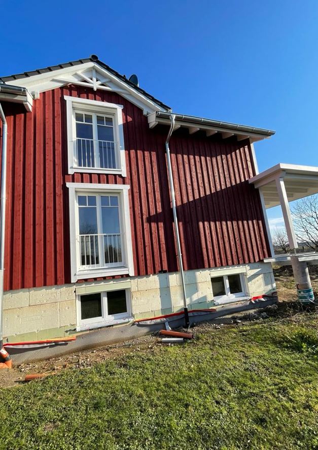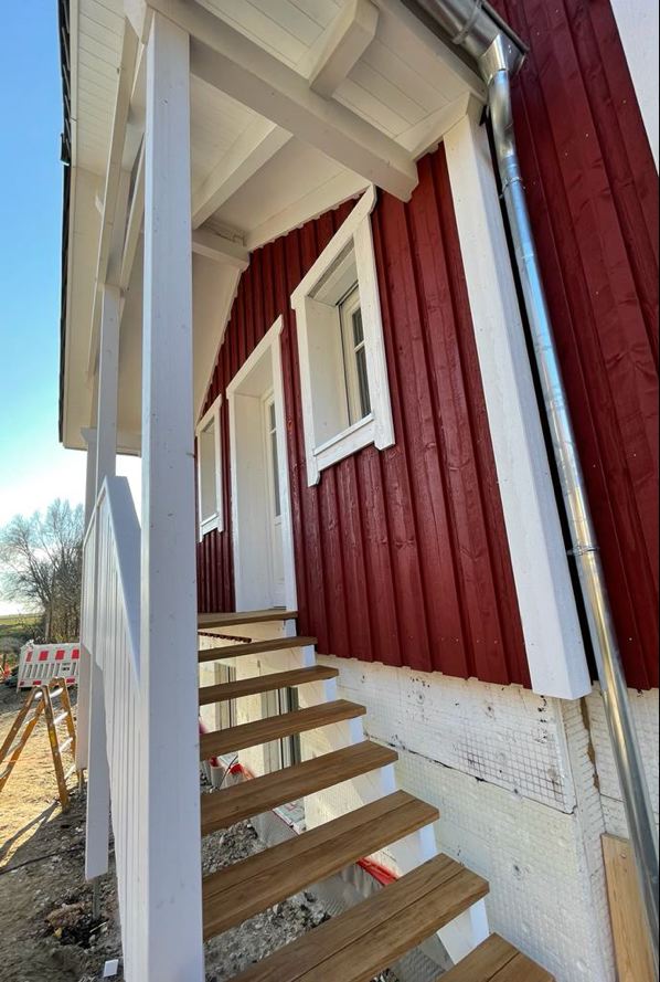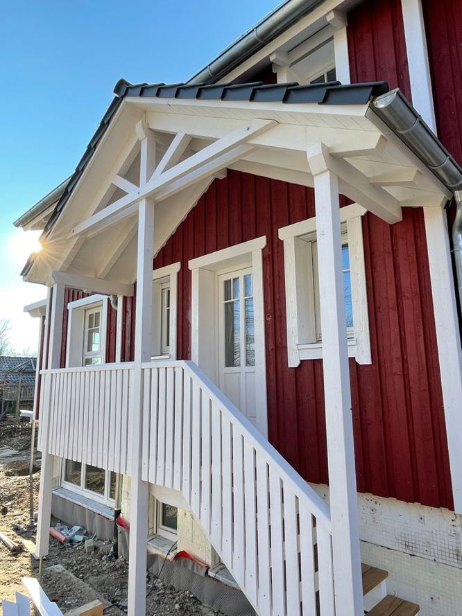 : Neubau eines Einfamilienhauses mit sichtbaren Vollholzelementen und einer Fassade im Schwedenstil.