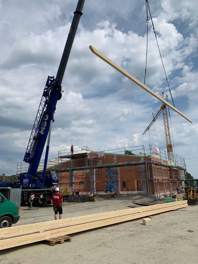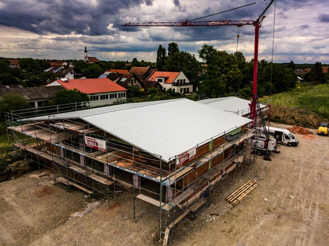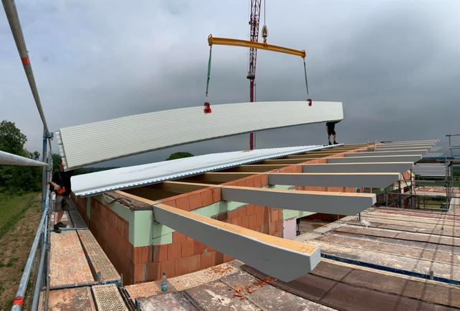 : Hier wurde von uns die Dachkonstruktion mit Bindern und Koppelpfetten montiert und die Dachflächen mit Sandwichplatten geschlossen.